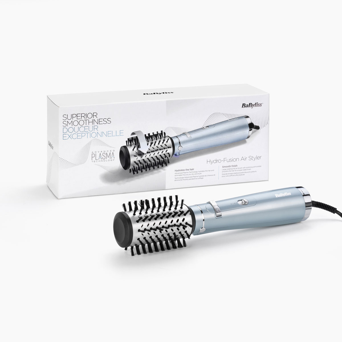 Our BaByliss Hydro-Fusion Anti-Frizz Hot Air Styler is a rotating hair dryer brush with a large 50mm ceramic barrel that dries and styles in one. The Advanced Plasma Technology uses a moisture balancing dual ionic system that combines both positive and negative ions to hydrate the hair and control frizz for a sleek blow dry finish with radiant shine. Part of our Hydro-Fusion Anti-Frizz Collection.