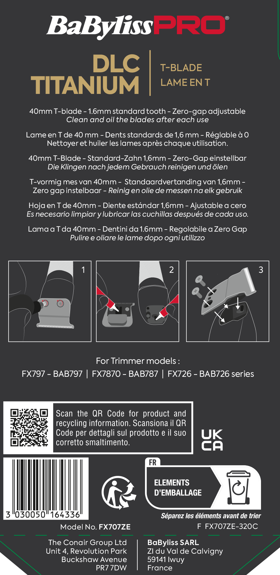 With a standard tooth T-blade (1.6mm) for precise clean cuts for all hair textures and skin sensitivity levels. Equipped to give you the best of both materials, these blades feature a titanium fixed blade & a DLC cutting blade for maximum cutting performance. It is designed to be used with FX797E, any FX7870 or FX726 outlining trimmers as well as any 2-hole blade system.