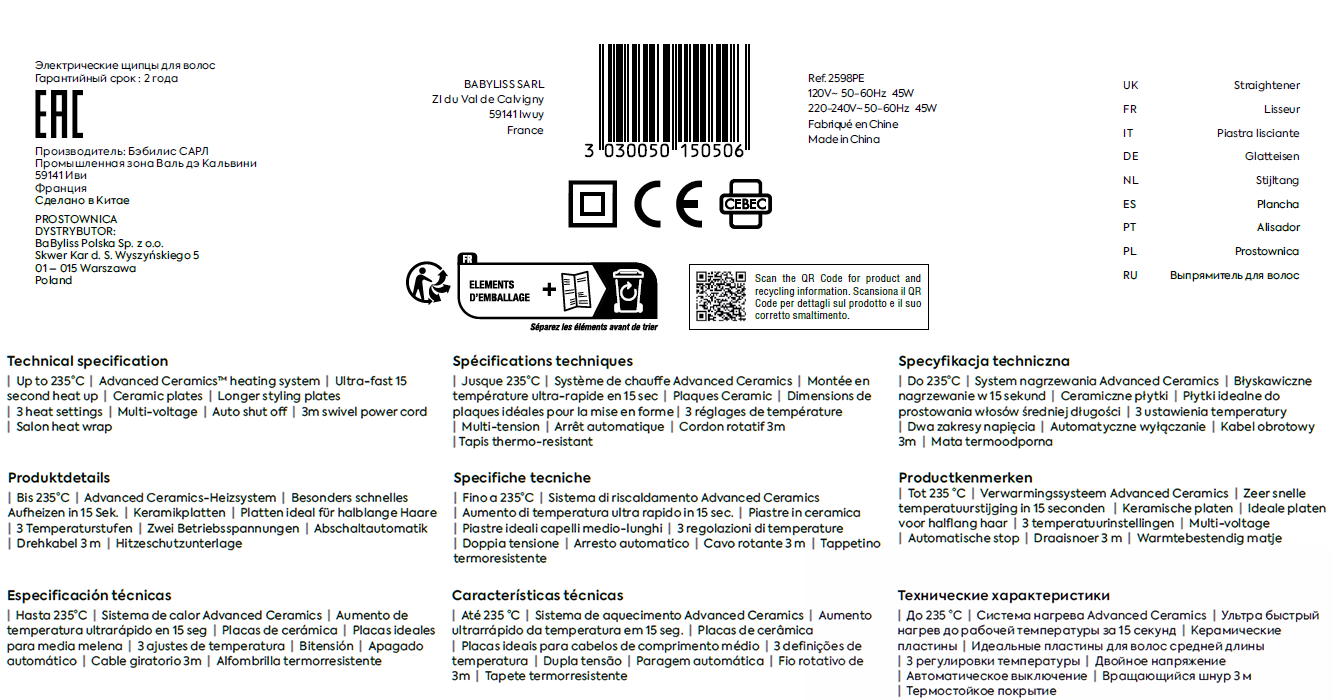 Det flotte BaByliss Elegance 235-glattejern med ekstra lange keramiske plader glider nemt gennem håret, hvilket sikrer hurtig styling og et elegant, glansfuldt resultat. Det professionelle Advanced Ceramics™-varmesystem sikrer ultrahurtig opvarmning og ensartet jævn varme i hver sektion, hvilket giver et glat resultat, der holder. 3 varmetrin fra 180 °C til 235 °C muliggør brug til alle hårtyper. Den ekstra lange ledning på 3 giver ultimativ fleksibilitet under stylingen.