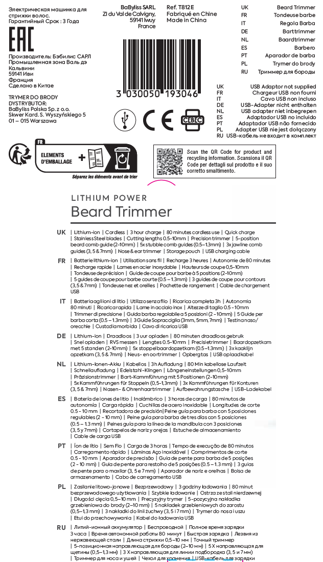 - 1 justerbar distanskam med 5 lägen för skägg (2, 4, 6, 8, 10 mm)