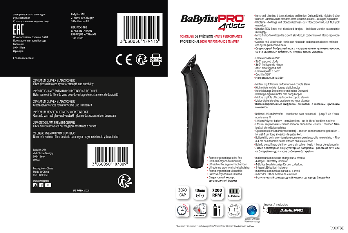 Nasz wysokoobrotowy trymer FX3 został zbudowany z lekkiego, ergonomicznego tworzywa ABS z włóknem węglowym dla jak największej wygody użytkowania. Całkowicie odsłonięte ostrze T zapewnia widoczność 360°, niezbędną przy szczególnie precyzyjnej pracy. Trymer wyposażony jest w wydajny akumulator litowo-polimerowy, który umożliwia nieprzerwaną pracę przez 240 minut po szybkim, 4-godzinnym ładowaniu, utrzymując stałą moc i prędkość (nawet gdy bateria słabnie). Dzięki 4-poziomowemu LED-owemu wskaźnikowi naładowania baterii zawsze wiesz, kiedy podłączyć trymer do ładowania. Narzędzie wyposażono w precyzyjne ostrze tytanowe/DLC, które umożliwia łatwe, gładkie cięcie, bez nagrzewania się ostrza.