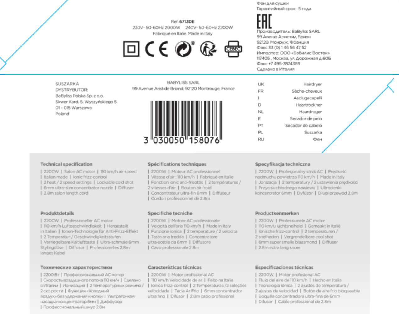 En italienskproduceret, professionel AC-hårtørrer på 2200 W.