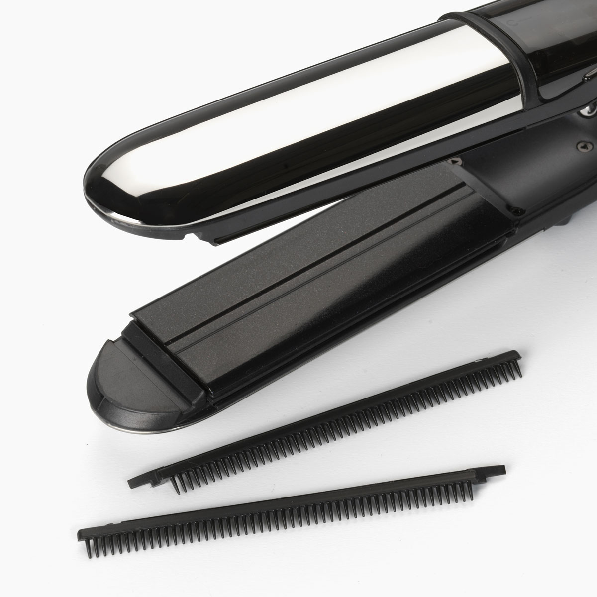 Med brede, diamant-keramiskbelagte plader og aftagelige kamme glatter det fuldstændigt med én enkelt bevægelse. Ion-teknologi kontrollerer krus og tilfører glans, mens du styler.