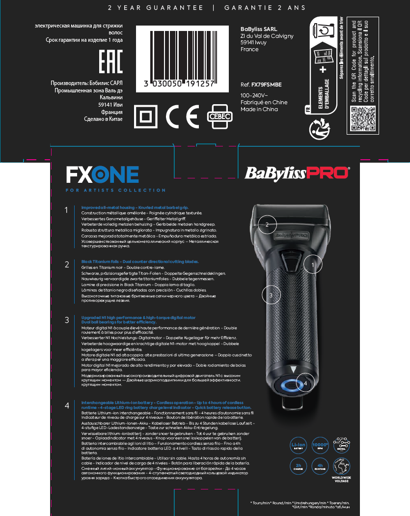 The FXONE All-Metal shaver er udstyret med det nye udskiftelige FXONE-litium-ion-batteri, som har en knap til hurtig frigørelse af batteriet. Den nye digitale N1-motor med dobbelte kuglelejer sikrer ensartet funktion i 4 timer efter 2 timers hurtig opladning. Den leveres med præcist konstruerede folier i sort titanium, hvilket sikrer et glat resultat, der holder længe, forskudt dobbelt folie og modsat kørende dobbelte skær til præcis, skarp fading eller helt glat tæt barbering op til hårgrænsen. Det drejelige hoved med låsefunktion følger hovedets og ansigtets form under barberingen. Den har et NYT forbedret kabinet helt i metal med ikonisk riflet greb og en NY konisk endehætte med skjult løkke til ophængning. Tag et kig på FXONE All Metal Black Clipper FX899MBU og Black Trimmer FX799MBU for at finde matchende FXONE-værktøjer, som alle er kompatible med det samme batteri.