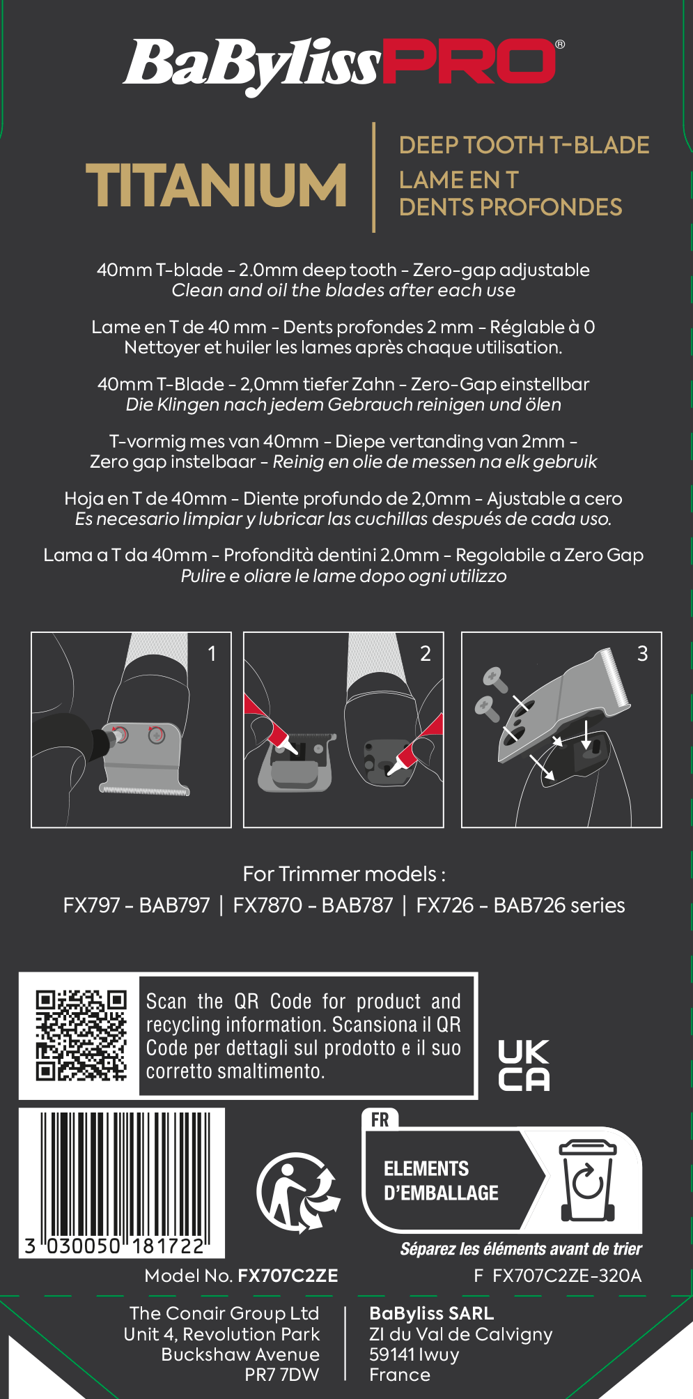 This deep tooth T-blade (2.0mm) is great for cutting crispy edge ups, hard lines and other fine details work, ideal for thick / coarse hair and less sensitive skin. Titanium coated blades are high strength blade known for their hardness allowing them to stay sharp longer. It is designed to be used with FX797E, any FX7870 or FX726 outlining trimmers as well as any 2-hole blade system.